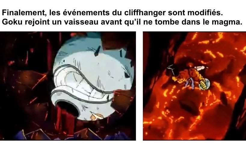 Un exemple de cliffhanger défaussé se trouve dans l’anime Dragon Ball Z : dans un épisode, Goku est montré semblant être encore dans le ciel au moment de l’explosion de Namek, avant que l’on ne révèle dans un autre épisode qu’il a finalement eu le temps de trouver un vaisseau.