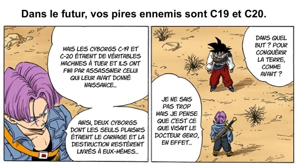 • Le retcon orwellien : une version antérieure est implicitement effacée au profit d’une nouvelle. Trunks annonce d’abord C-19 et C-20 comme les androïdes destructeurs, avant de ne plus les reconnaître et d’identifier C-17 et C-18 comme la véritable menace, sans correction explicite.