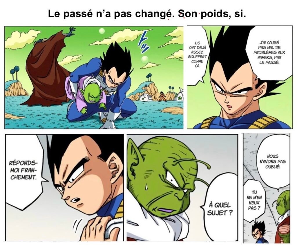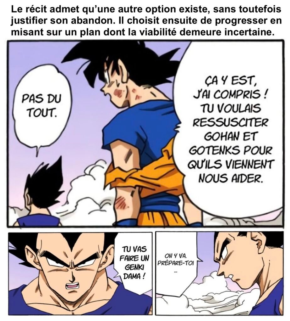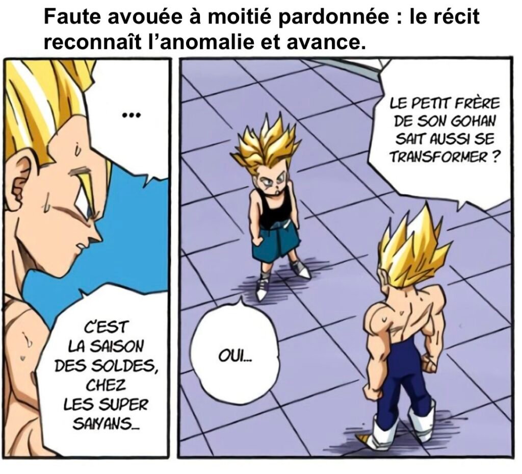 La remarque de Vegeta sur les « soldes de Super Saiyan » quand Goten et Trunks se transforment constitue un bel exemple de « faute avouée à moitié pardonnée », où la série reconnaît explicitement la banalisation d’un élément jadis exceptionnel sans chercher à la corriger.