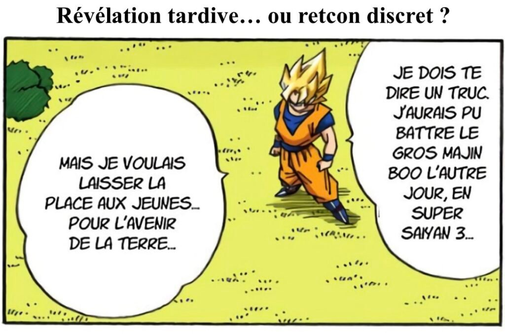 Un exemple ambigu se trouve dans l’arc Buu : Goku affirme d’abord qu’il ne peut probablement pas vaincre le gros Buu, avant de suggérer plus tard qu’il en aurait été capable. Piccolo lui-même semble douter de cette affirmation et lui demande pourquoi il n’a pas essayé, comme si le récit laissait volontairement une porte ouverte. Nous nous situons ici à la frontière entre retcon et révélation.